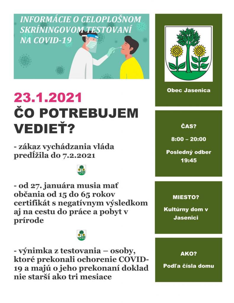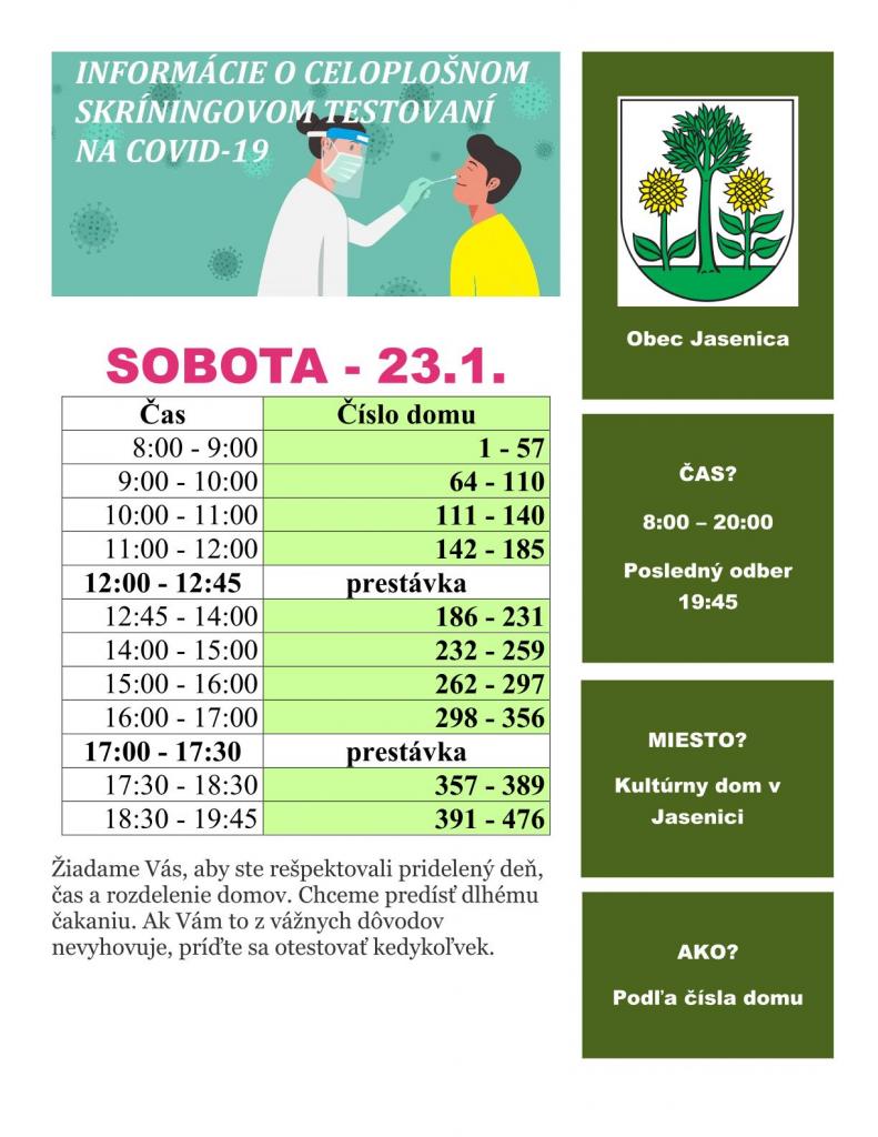 V sobotu 23.1. sa v našej obci uskutoční skríningové testovanie na ochorenie Covid 19.