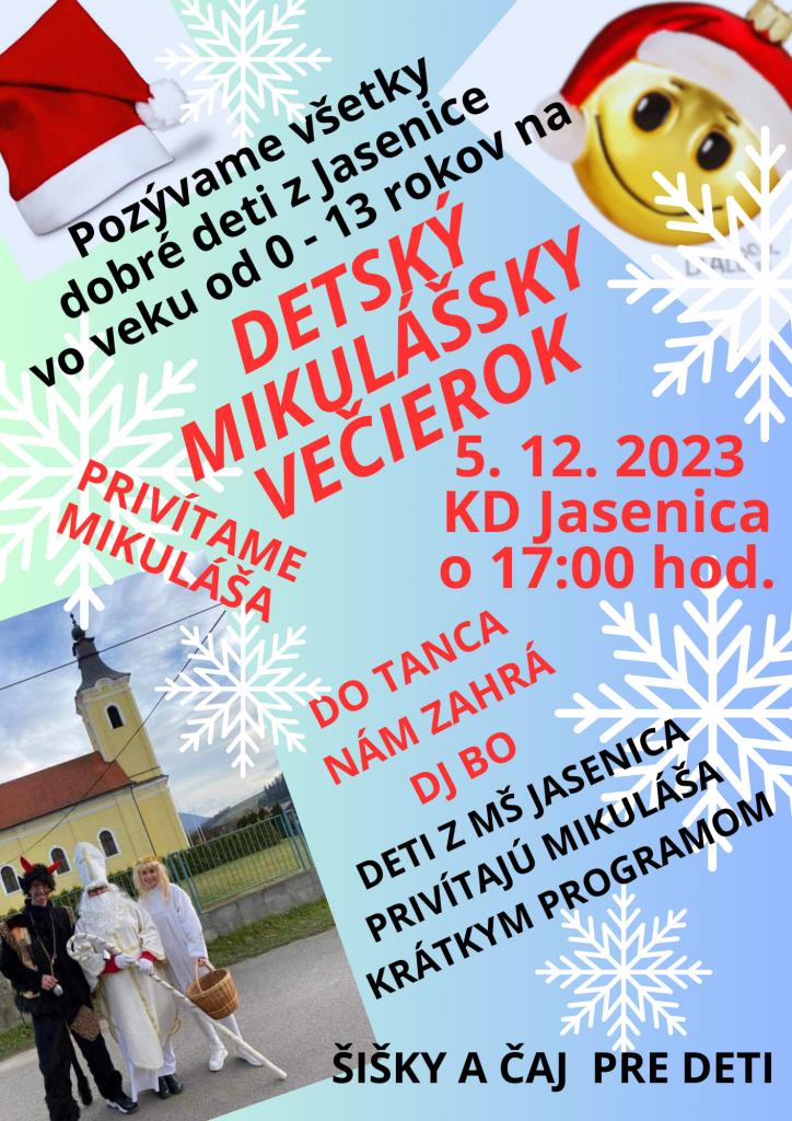 Pozývame všetky jasenické deti vo veku od 0 do 13 rokov dňa 5.12.2023 o 17:00 hod. na Mikulášsky večierok do kultúrneho domu.